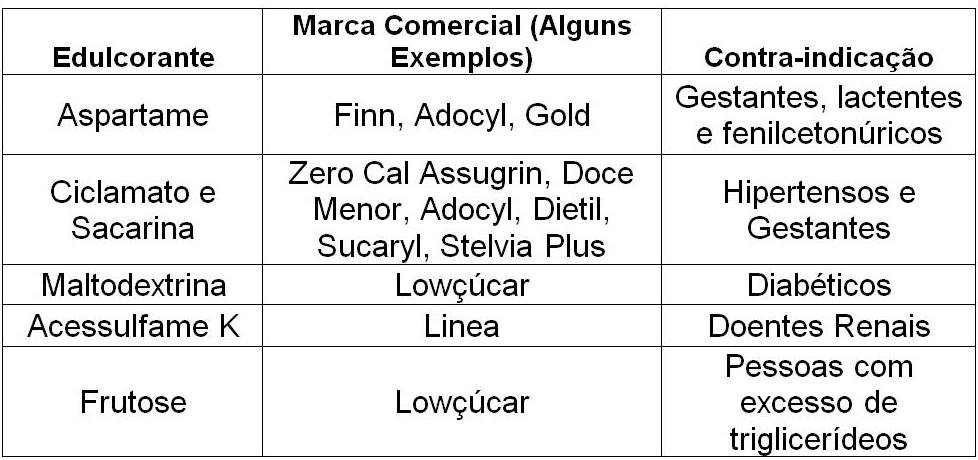 A escolha do tipo de adoçante deve ser feita de forma criteriosa, observando-se o edulcorante presente em sua formulação, pois alguns podem causar prejuízos à saúde de determinados grupos populacionais, como por exemplo o ciclamato e a sacarina, que contém em sua formulação o sódio que é prejudicial aos hipertensos. Edulcorante é o princípio ativo que confere o sabor doce ao adoçante. A maioria dos edulcorantes contém algum tipo de contra-indicação, segue tabela com os alguns exemplos: